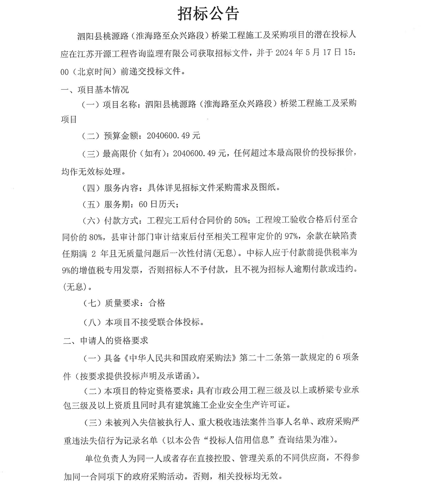 泗陽(yáng)縣桃源路(淮海路至眾興路段)橋梁工程施工及采購(gòu) 項(xiàng)目招標(biāo)公告
